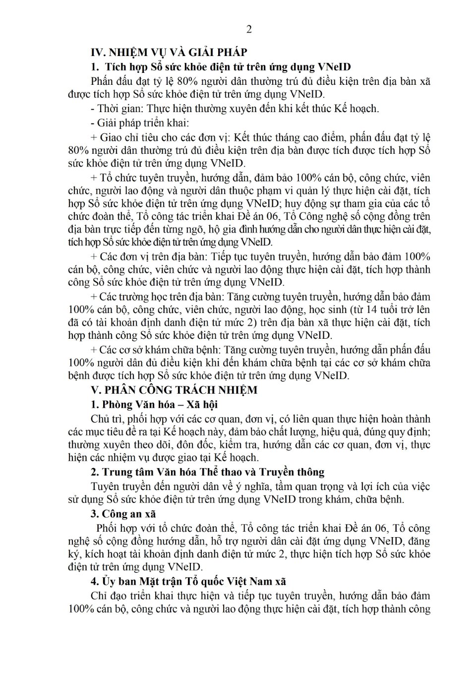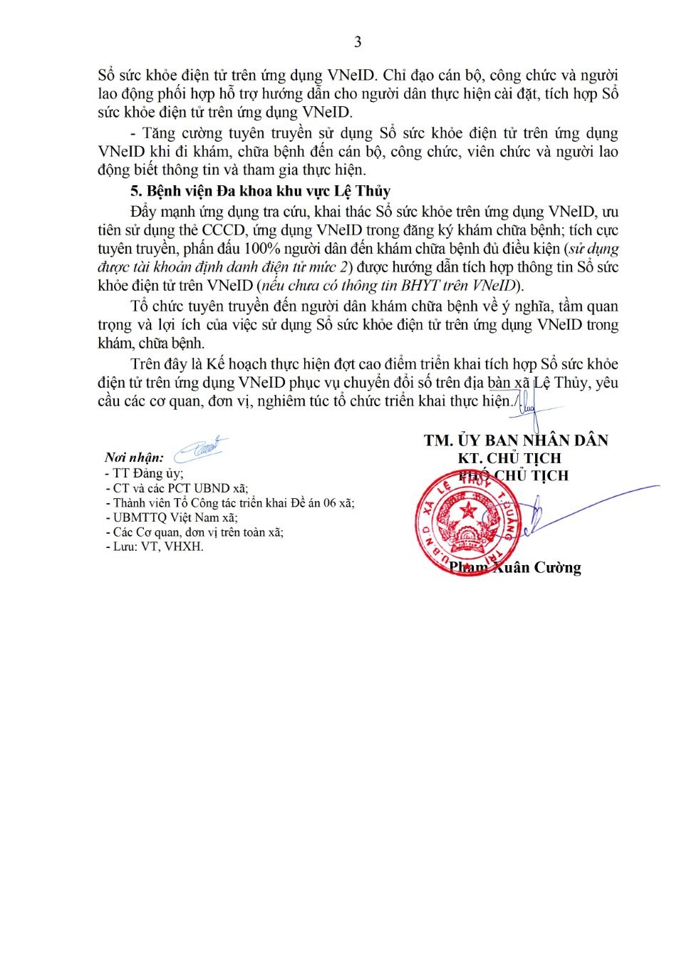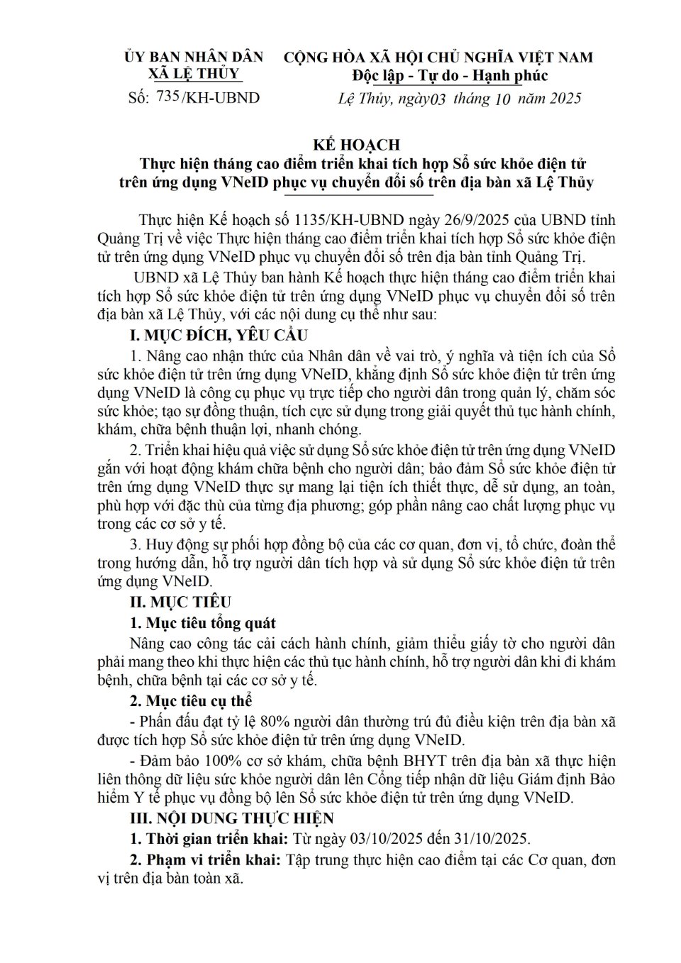 Kế hoạch số 735 về việc thực hiện tháng cao điểm triển khai tích hợp Sổ sức khỏe điện tử trên ứng dụng VNeID phục vụ chuyển đổi số trên địa bàn xã Lệ Thủy